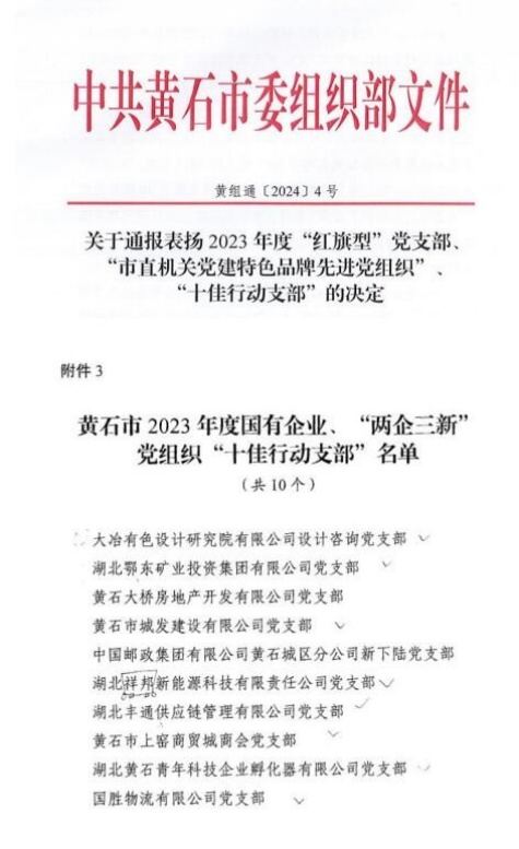 【喜報(bào)】喜訊!城發(fā)建工集團(tuán)城發(fā)建設(shè)公司黨支部獲評(píng)2023年度黃石市國(guó)有企業(yè) “十佳行動(dòng)支部”