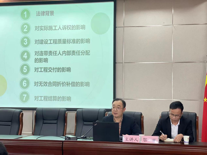 活動邀請湖北易圣律師事務(wù)所鄂彬律師擔(dān)任主講,鄂律師從《民法典》對施工人員訴求、工程質(zhì)量標準、內(nèi)部責(zé)任分配、工程交付、合同折價補償、工程結(jié)算等六大影響作了深入淺出、生動細致的講解,具有很強的針對性和實用性,使參加培訓(xùn)的人員收獲頗深。