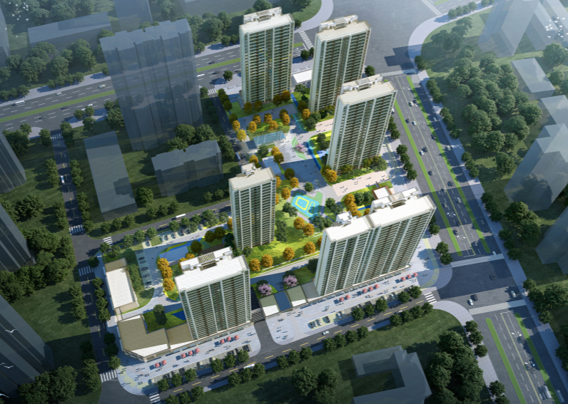 該項目位于黃石下陸區(qū)蘇州路以南,白馬路以西,規(guī)劃總用地面積33261.23平方米,總建筑面積約97710.81㎡,項目容積率2.59,建筑密度21.14%,綠地率30.51%。項目共包含6棟高程住宅樓、2棟商鋪、2棟單層配電室及配套門廳等建筑,項目規(guī)劃戶數(shù)595戶,機動車停車位646個,非機動車停車位598個。