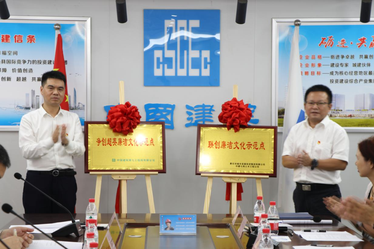 啟動儀式上,觀看了習(xí)近平總書記“七一”講話視頻、《向城而生》宣傳片、陳超英事跡新聞《時代先鋒:陳超英》。宣讀了“超英廉潔文化示范點”聯(lián)創(chuàng)共建實施方案。聯(lián)創(chuàng)共建“三方”紀(jì)委書記共同簽訂《“超英廉潔文化示范點”聯(lián)創(chuàng)共建協(xié)議書》。集體宣讀廉潔從業(yè)誓詞、向廉潔監(jiān)督員頒發(fā)聘書,為奮斗在項目一線的黨員、管理人員和青年代表授旗,為項目部“廉潔書屋”贈送廉潔文化書籍。隨后,在熱烈的掌聲中,黃訓(xùn)能、李艷志共同為項目“爭創(chuàng)超英廉潔文化示范點”“聯(lián)創(chuàng)廉潔文化示范點”揭牌。